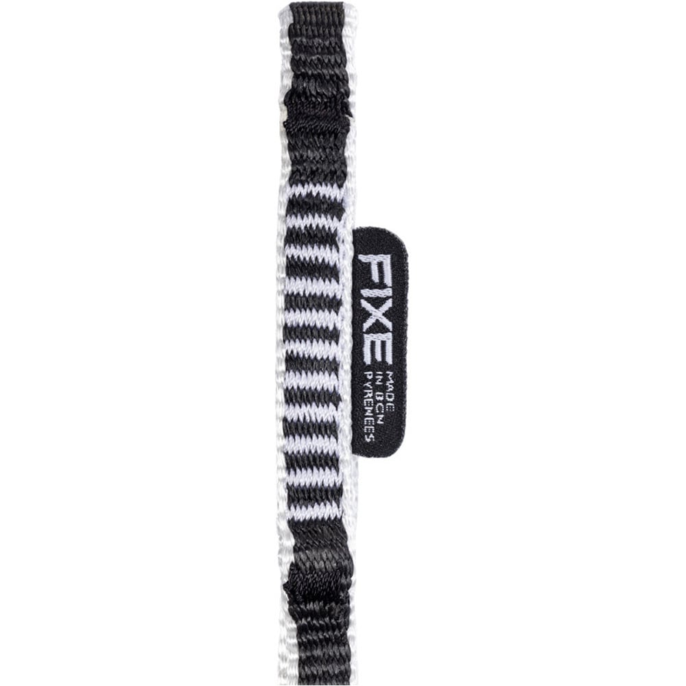 Anilla cosida de cinta. Las costuras de la anilla, tanto en las puntas como en los laterales, están rematadas para evitar que se enganchen al realizar maniobras en las reuniones, con mosquetones, etc. El logotipo distintivo de Fixe se cose en el lateral de la anilla para evitar roces en las maniobras también y además los cantos de la etiqueta están redondeados.