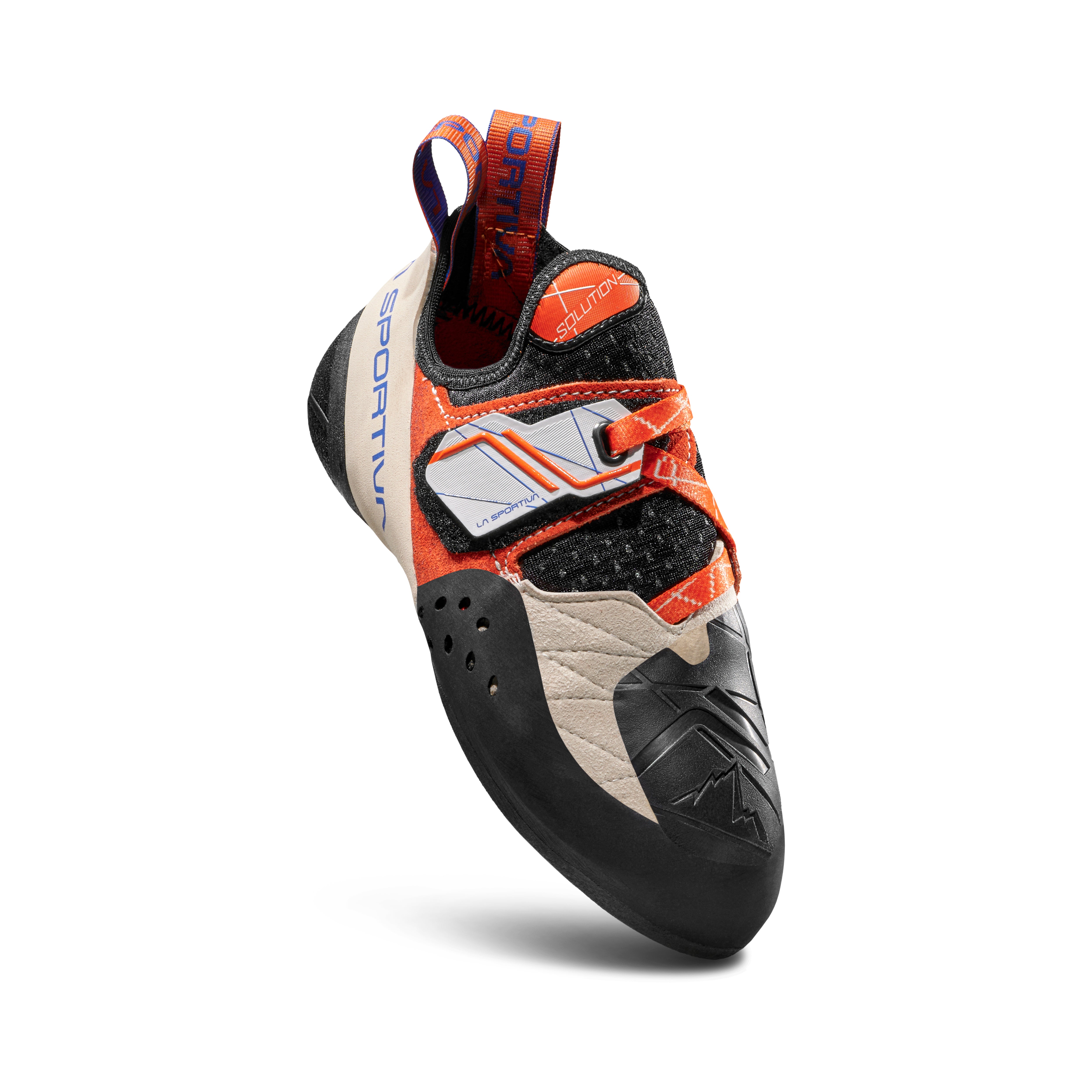 Las zapatillas de escalada La Sportiva Solution para mujeres en color blanco/lirio naranja son ideales para escalar con total comodidad y seguridad. Con un peso de 7.9 oz / 225 g y una forma asimétrica y agresiva, te permiten alcanzar tus objetivos en la roca. Disponibles en tallas 33-43 (medias tallas) y con suela Vibram, te brindan un gran rendimiento y tracción. Su cierre con cordones asegura un ajuste perfecto. ¡Conquista las alturas con las La Sportiva Solution!