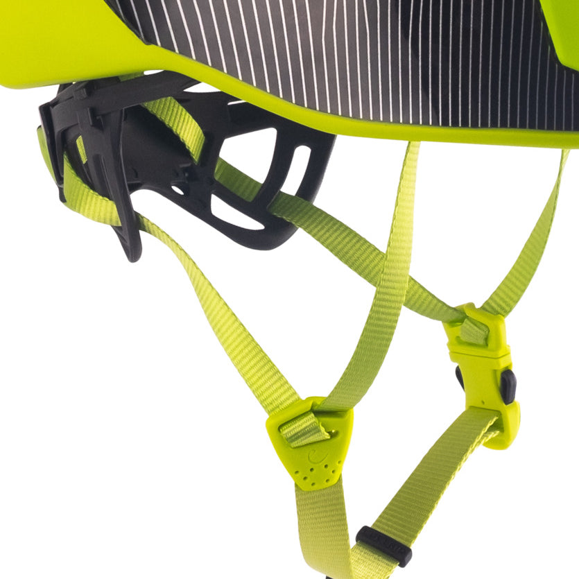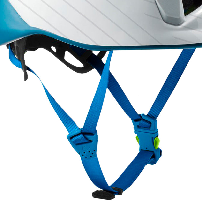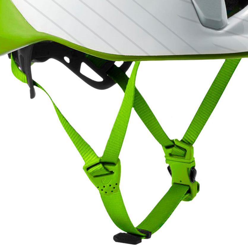 Los adaptadores laterales del barboquejo, situados debajo de la oreja, permiten la regulación independiente de cada lado. Gracias a este sistema se evitan rozaduras ya que la barbilla y el cuello no tienen en contacto ningún clip.