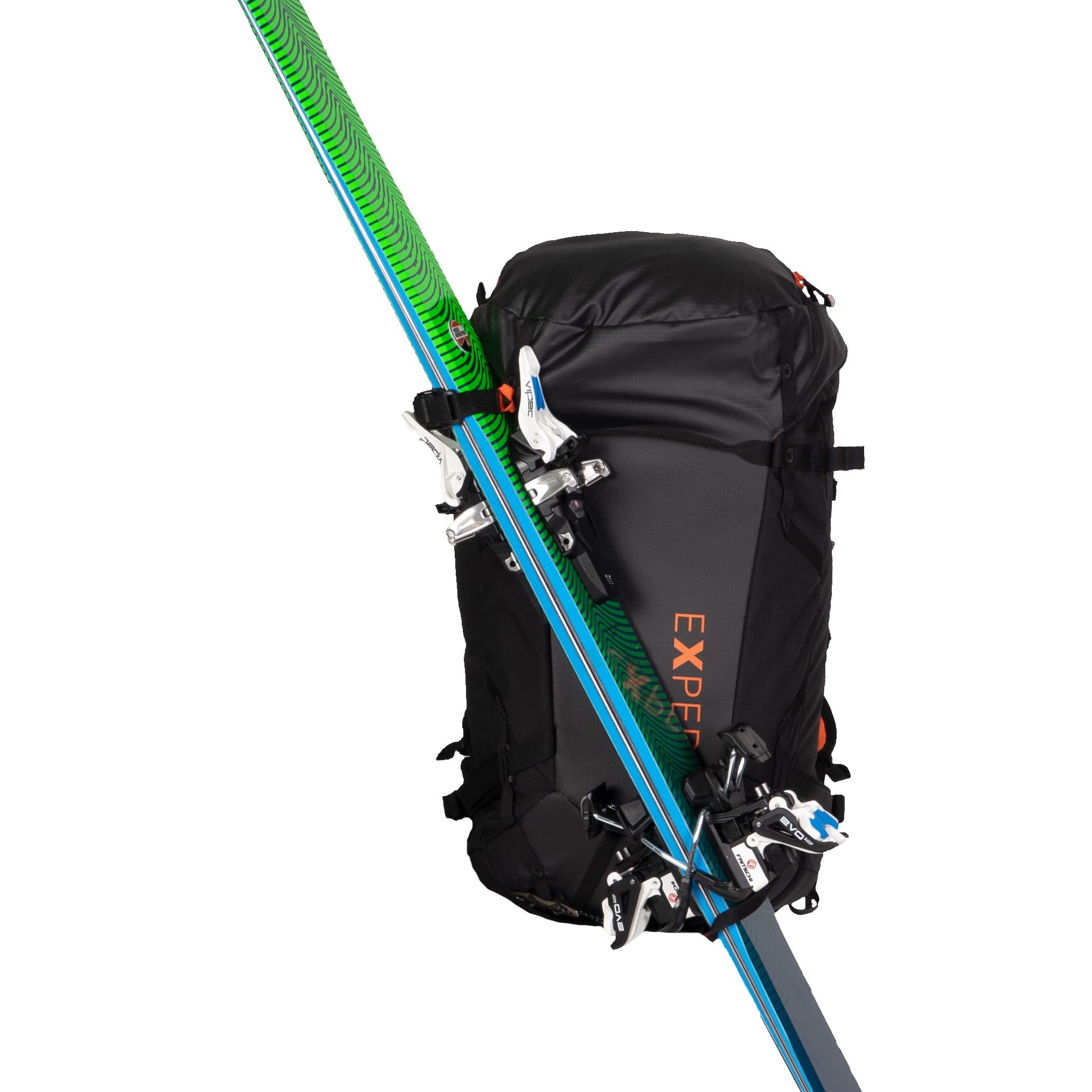 Los esquís se pueden atar al costado como un marco en A o se fijan de forma rápida y práctica en diagonal.