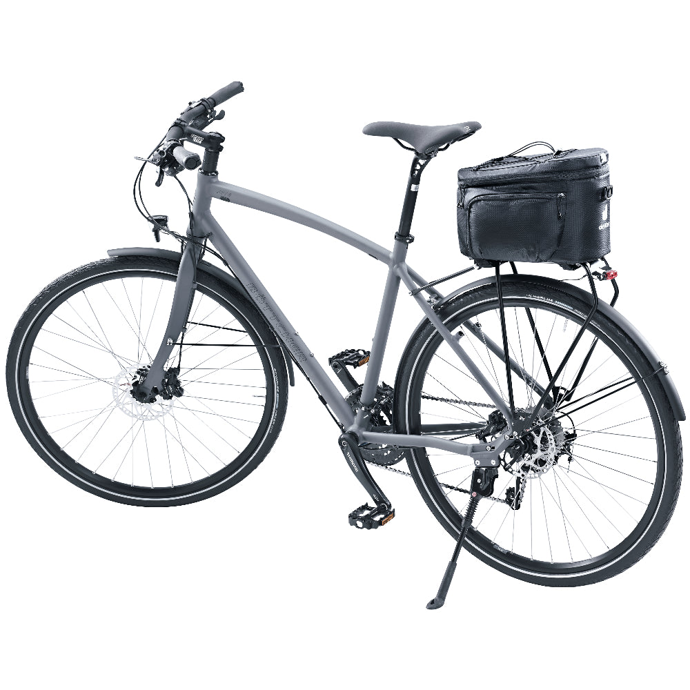 La bolsa para bicicleta Rack Bag 10 de Deuter es fácil de colocar con dos correas de gancho y lazo. Cuenta con un amplio compartimento principal con cierre de cremallera para guardar capas adicionales y otros objetos. Disponible en color negro, es ideal para llevar tus pertenencias de forma segura en tus paseos en bicicleta.