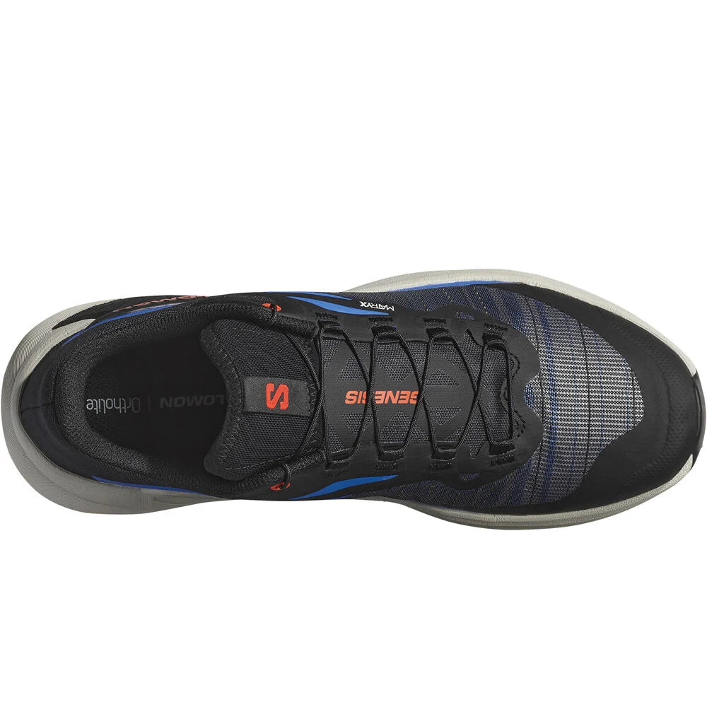 • Las zapatillas trail running Salomon GENESIS Negro Azul están realizadas en tejido Matryx® ligero y resistente, gracias a los hilos de Kevlar®. Cuentan con un diseño cómodo y duradero, con una pala inconfundible que se ajusta de forma óptima. Los contrafuertes exteriores Active Chassis™ ayudan a mantener la estabilidad y soporte del pie. El sistema Quicklace™ de atado rápido con bolsillo para los cordones. Refuerzo de protección en la puntera.
