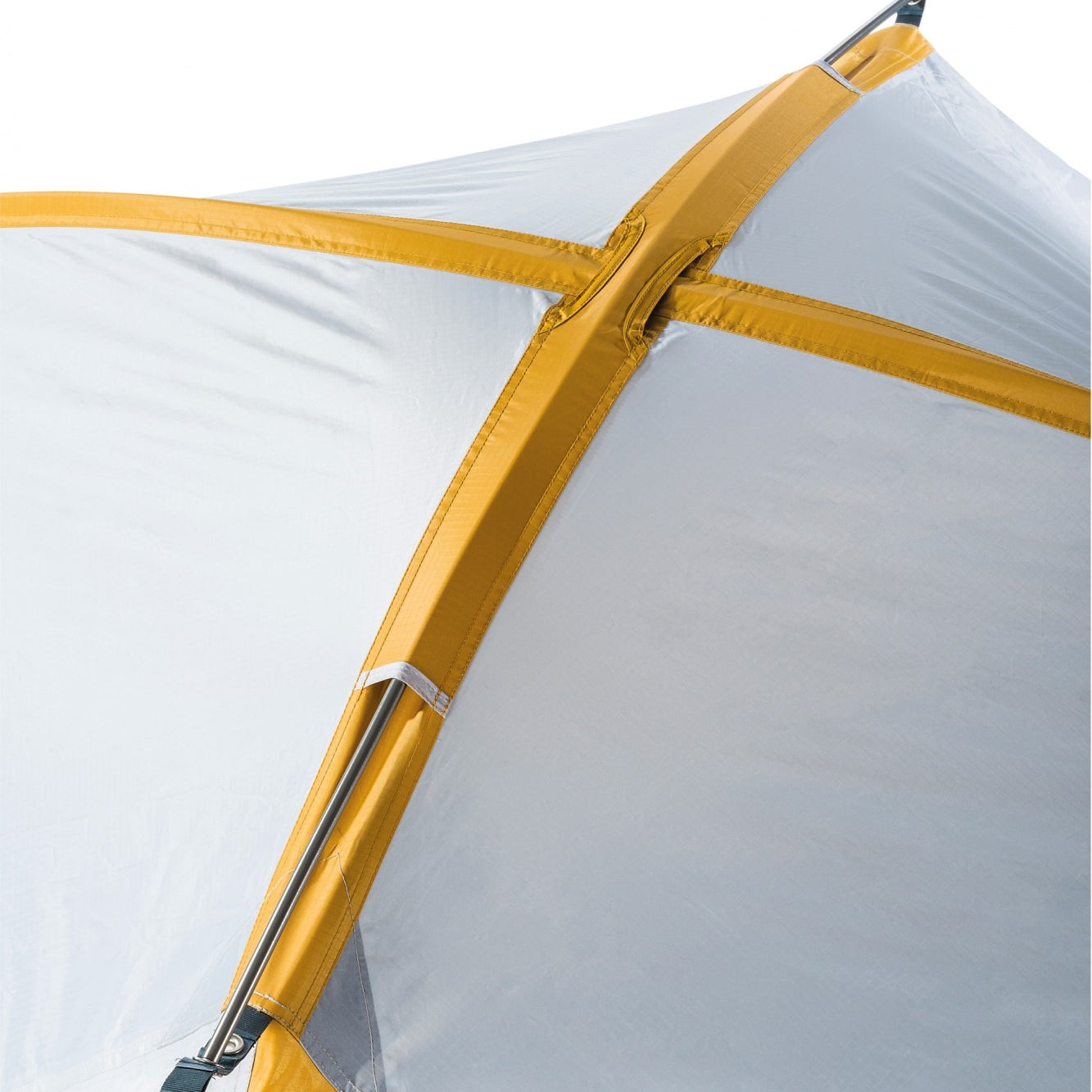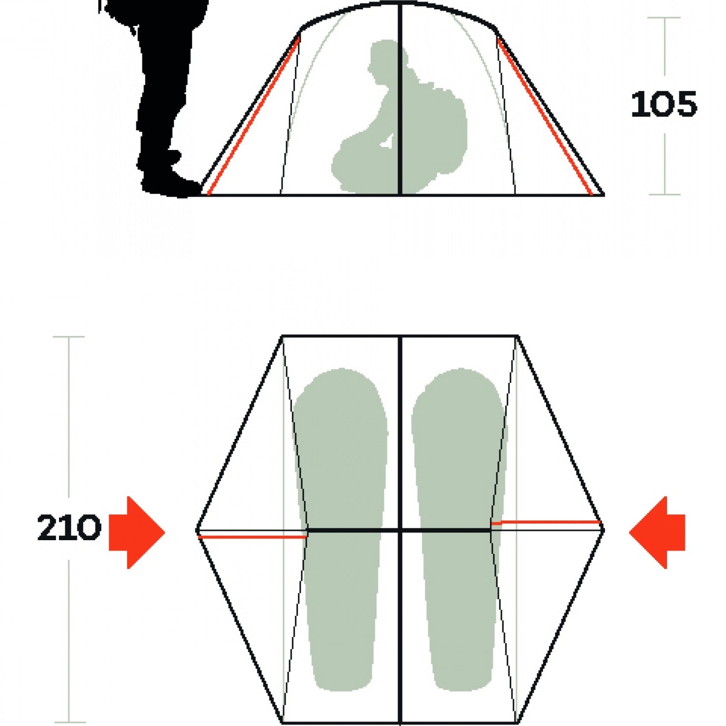 Tienda de 2 plazas muy ligera y básica. El sistema mixto de un techo con amplias aplicaciones de mosquitera en la zona de los vestíbulos la convierten en el refugio excelente durante las actividades de senderismo o excursiones en bicicleta. Estructura: Dome