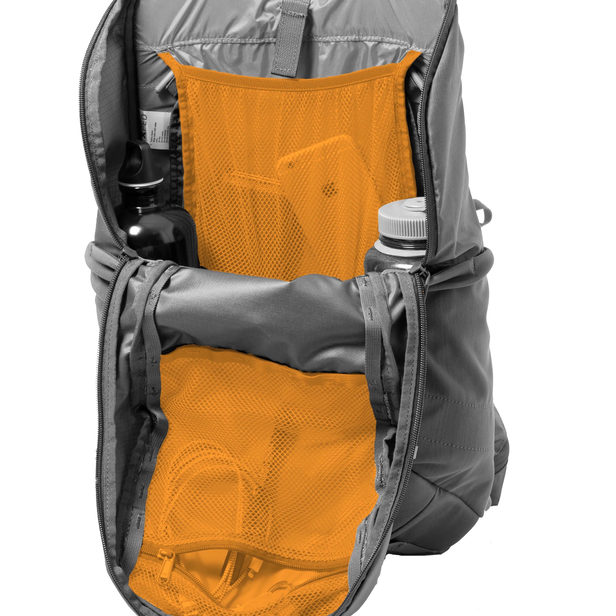 Dispone de una gran cremallera que permite un acceso amplio al compartimento principal, donde se puede integrar un sistema de hidratación y asegurar botellas de agua. Una malla interior adicional ayuda a mantener el orden. En el exterior, cuenta con tres bolsillos de malla para guardar objetos pequeños y varias presillas para asegurar material adicional.