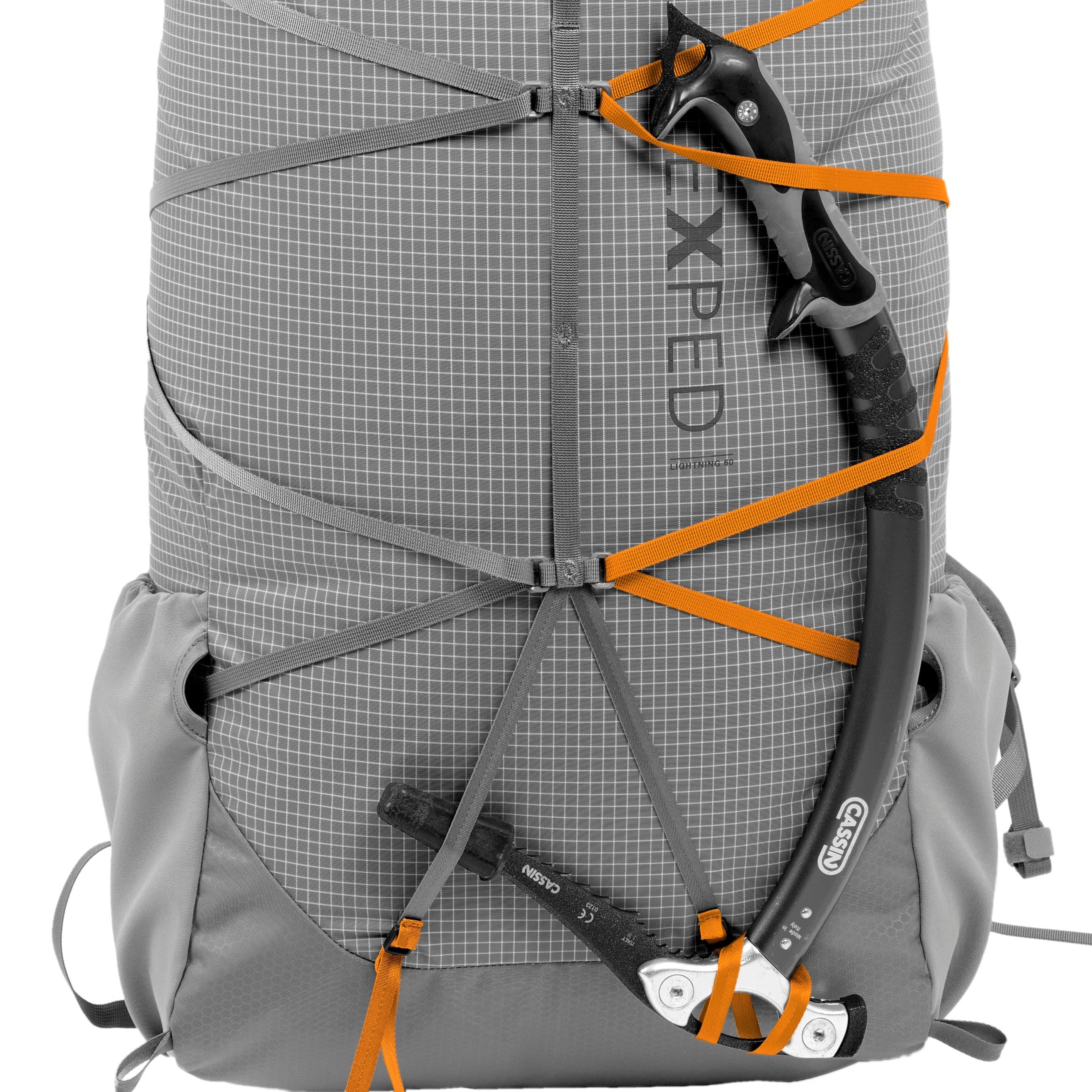 Las correas de compresión laterales en zig-zag y una correa de cincha que atraviesa la mochila con hebillas de liberación rápida mantienen el equipo como colchonetas o un doble techo en su lugar de forma segura. Aquellos que usan el Lightning para el montañismo colocan herramientas de hielo en los bucles designados y en la cadena de margaritas central.