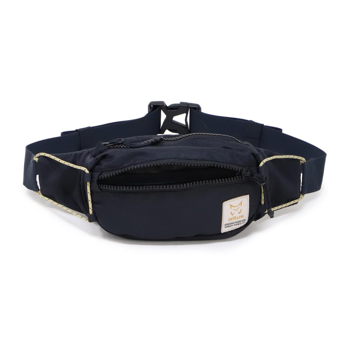 Riñonera polivalente con múltiples compartimentos en interior y exterior con cierres de cremallera.