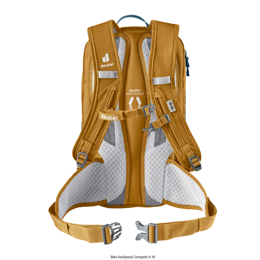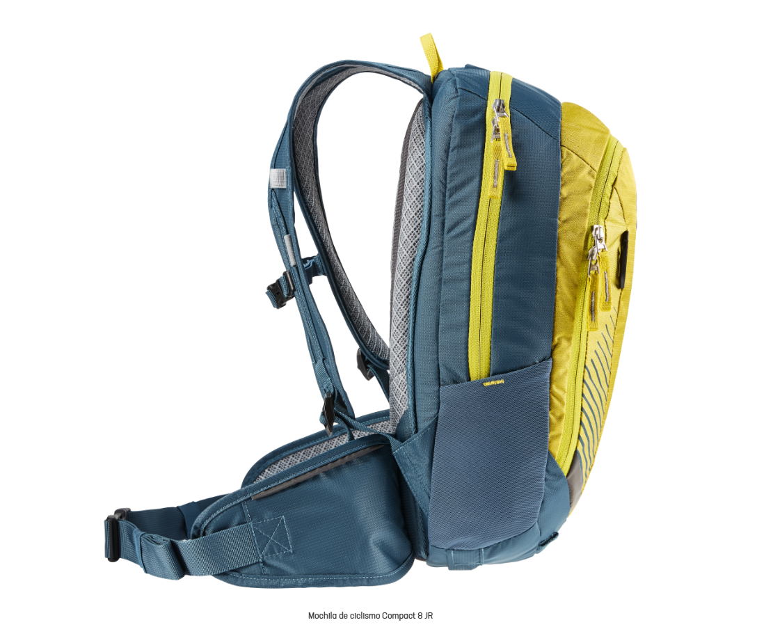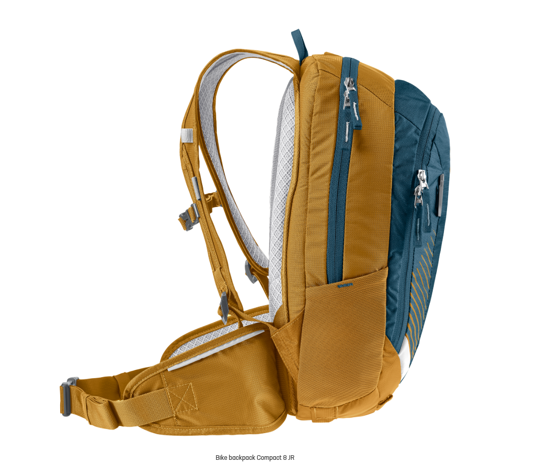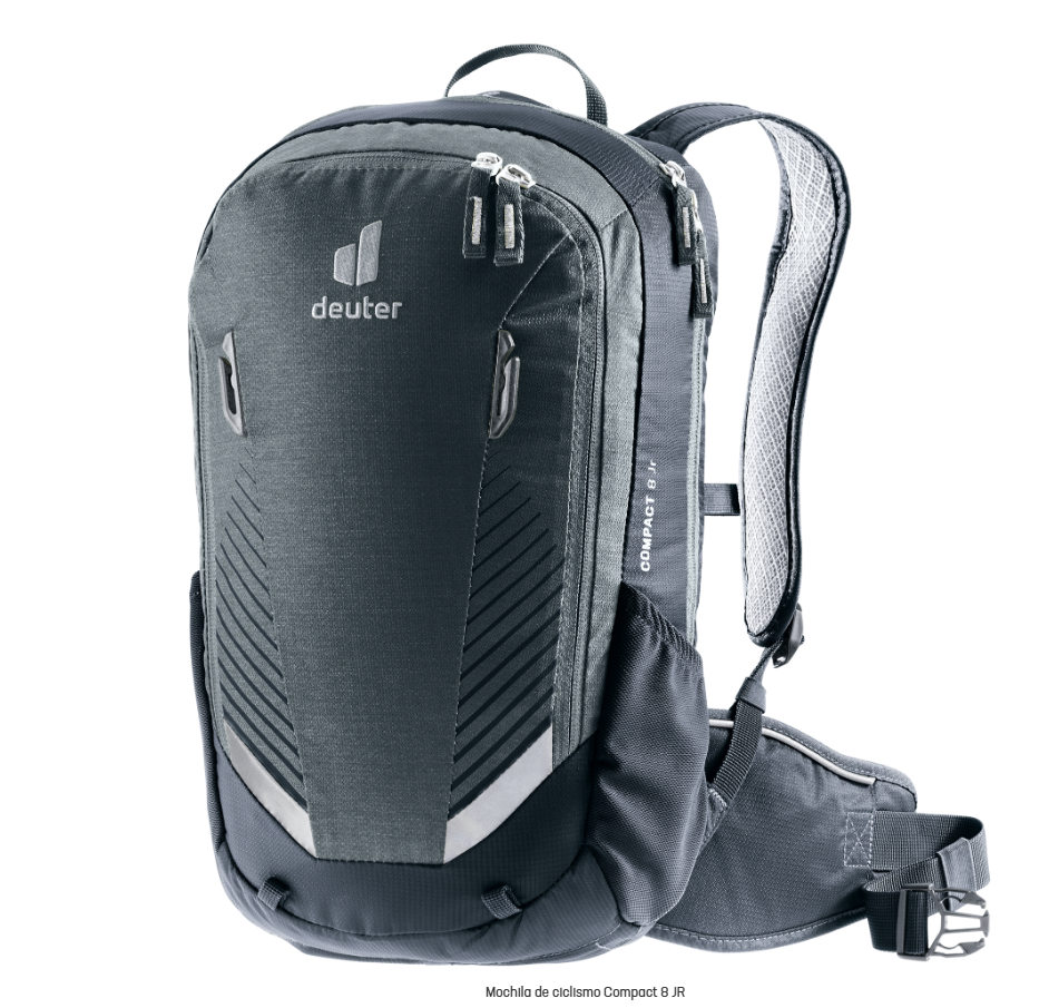 Una mochila de bicicleta de montaña para jóvenes talentos: la Compact 8 Jr. Con sus tirantes ergonómicos, su correa de pecho ajustable y sus alas de cadera, se sienta firme y cómodamente en la espalda y se mantiene pegada al cuerpo incluso en los giros rápidos. La mochila para bicicletas también impresiona por sus bien pensadas características: un gancho para llevar la protección dorsal retráctil en la parte inferior de la mochila, un práctico portacascos con clips de sujeción, un espacioso compartimento principal para ropa y provisiones de repuesto, un compartimento para herramientas de rápido acceso y dos bolsillos laterales elásticos.
