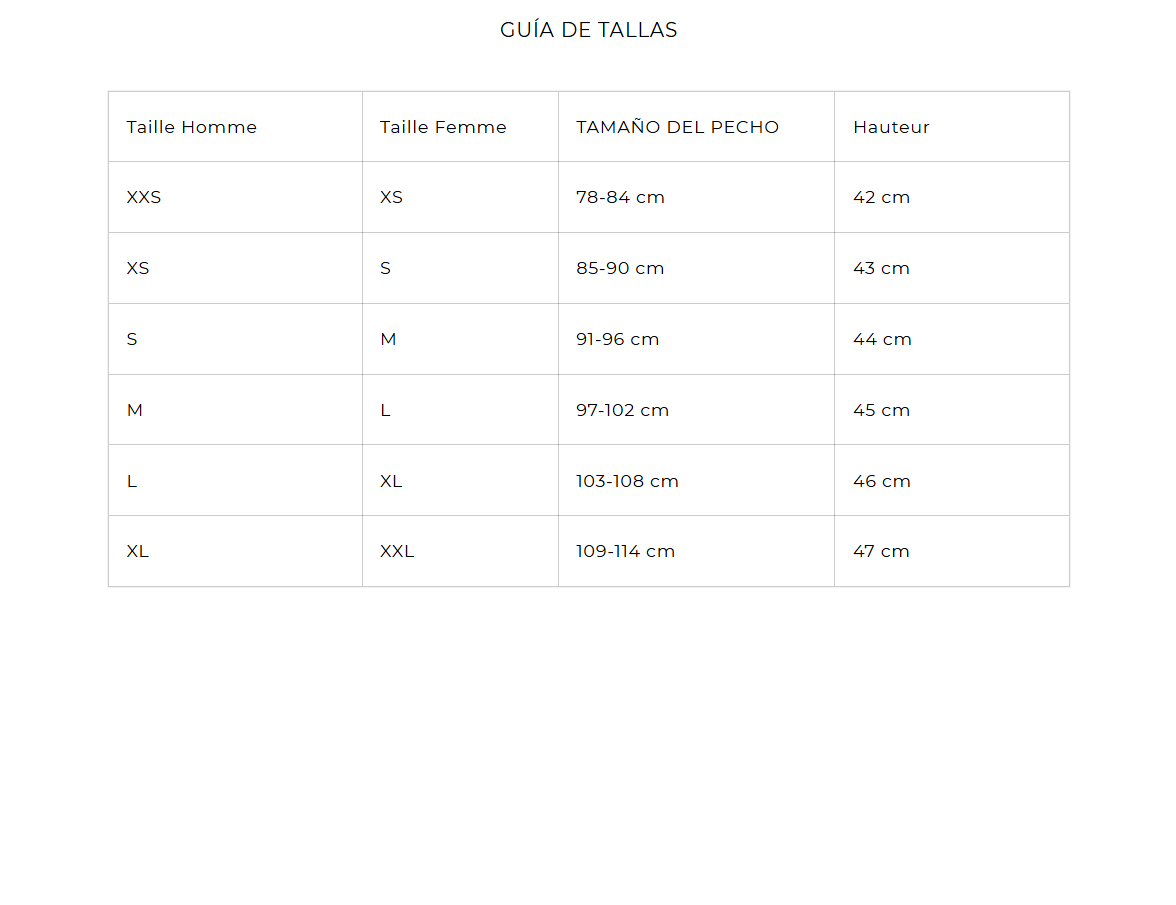 | Talla | XS/34 | S/36 | U/M/38 | L/40 | XL/42 |