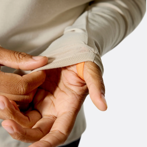 - Los orificios para los pulgares evitan que las mangas se suban cuando practicas búlder.