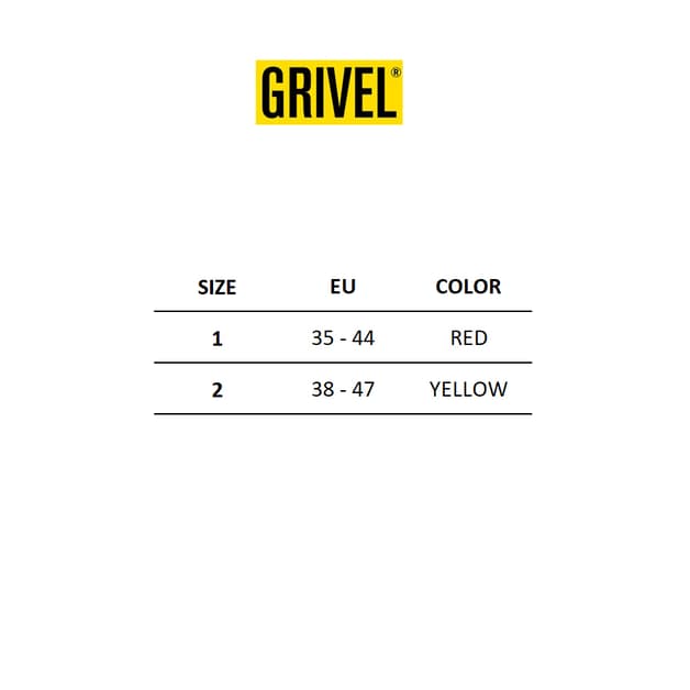 - Tallas disponibles: talla 1: de 35 a 44 (rojo), y talla 2: de 38 a 47 (amarillo)