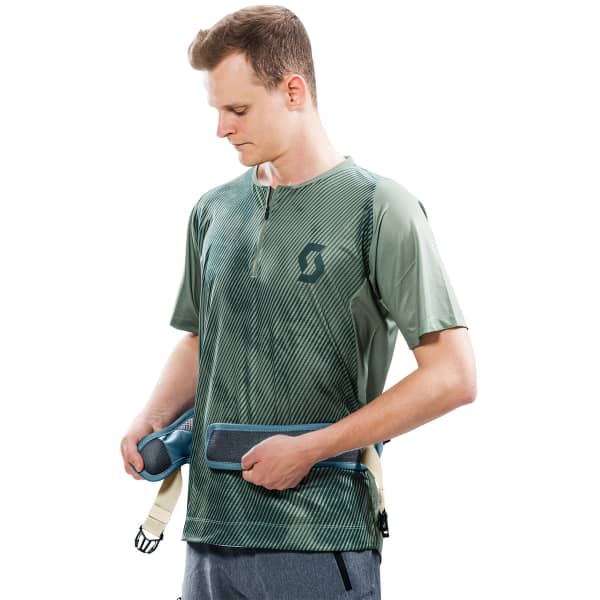 Con sus múltiples unidades organizativas, este modelo te permite guardar tu botella de agua en el portabidón, tu teléfono móvil en el bolsillo con cremallera del cinturón, tus herramientas en el bolsillo interior de malla, tu tentempié en el compartimento principal y tus rodilleras en el exterior de la bolsa. Ergonómicamente diseñada para ajustarse al cuerpo, garantiza una total libertad de movimientos y se mantiene perfectamente en su sitio tanto en senderos fluidos como en tramos técnicos.