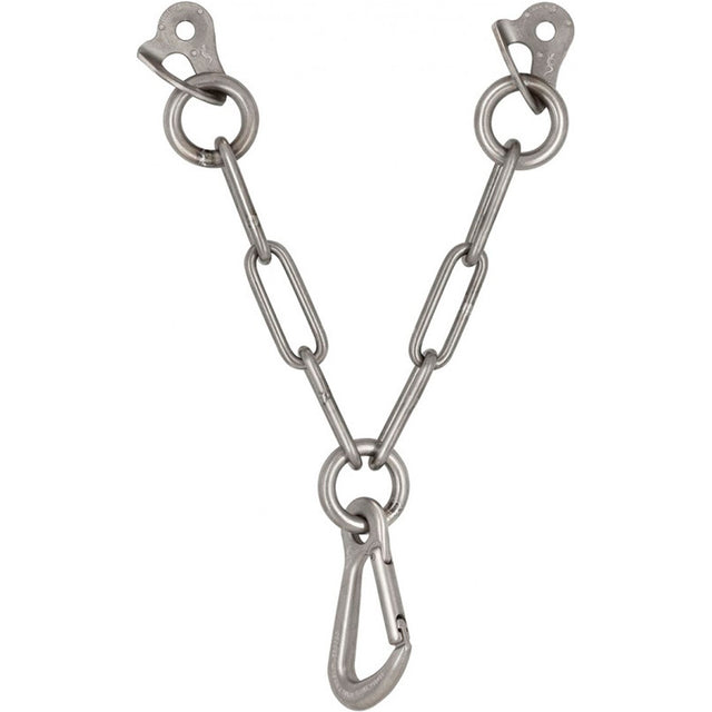 Características de la cadena de acero cincado ecotri: Diámetro de varilla de eslabón de 7mm. Longitud útil: 185mm. Resistencia límite: 25kN. Material: acero cincado ecotri. Características del mosquetón Draco: Cierre keylock. Zona de rozamiento sobredimensionada. Resistencia límite: 25kN.