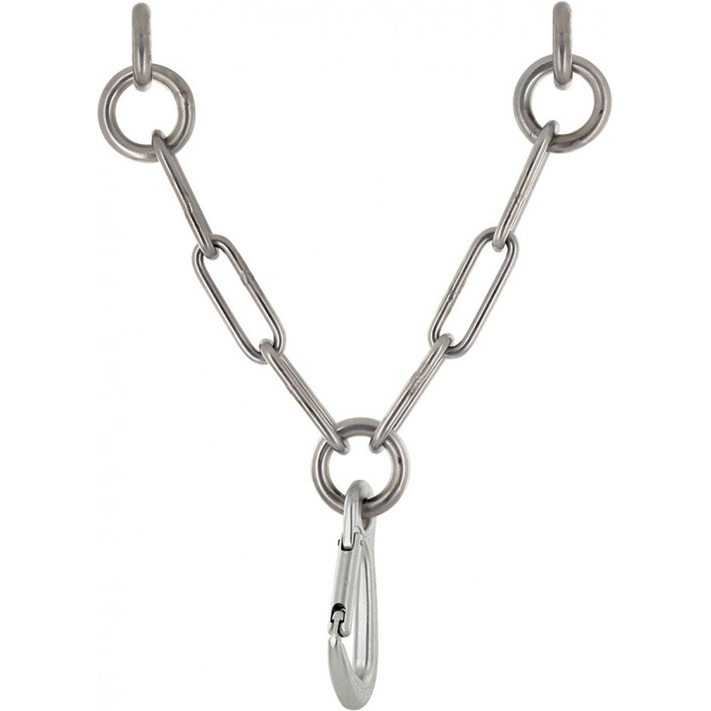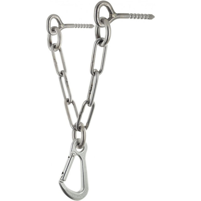 Características de la cadena de acero inoxidable 316L: Soldadura en TIG. Mejor resistencia a la corrosión. Reducción del número de eslabones a tres. Menor cantidad de puntos críticos. Diámetro de varilla de eslabón: 7mm. Longitud útil: 185mm. Resistencia límite: 25kN. Material: acero inoxidable 316L. Características del mosquetón Draco: Cierre keylock. Zona de rozamiento sobredimensionada. Resistencia límite: 25kN. Material: acero inoxidable 316L.